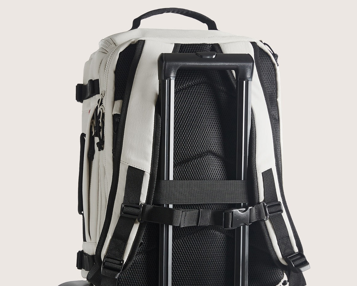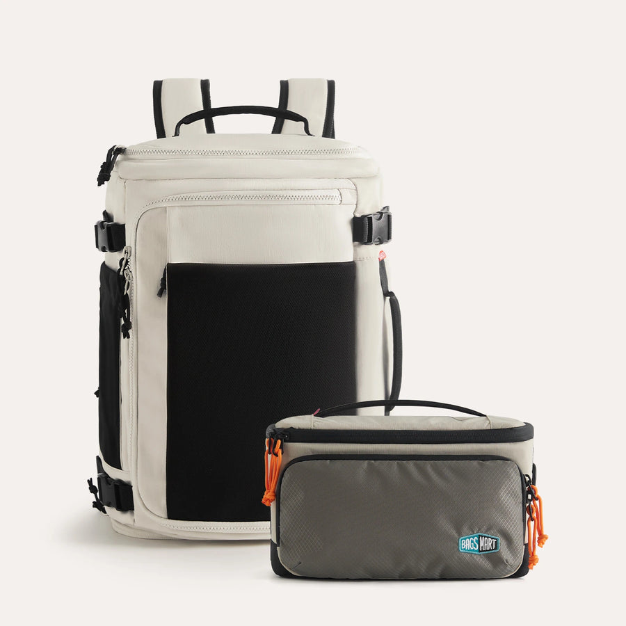 Backpack: 28–38L expandable capacity with smart compartments and USB port
