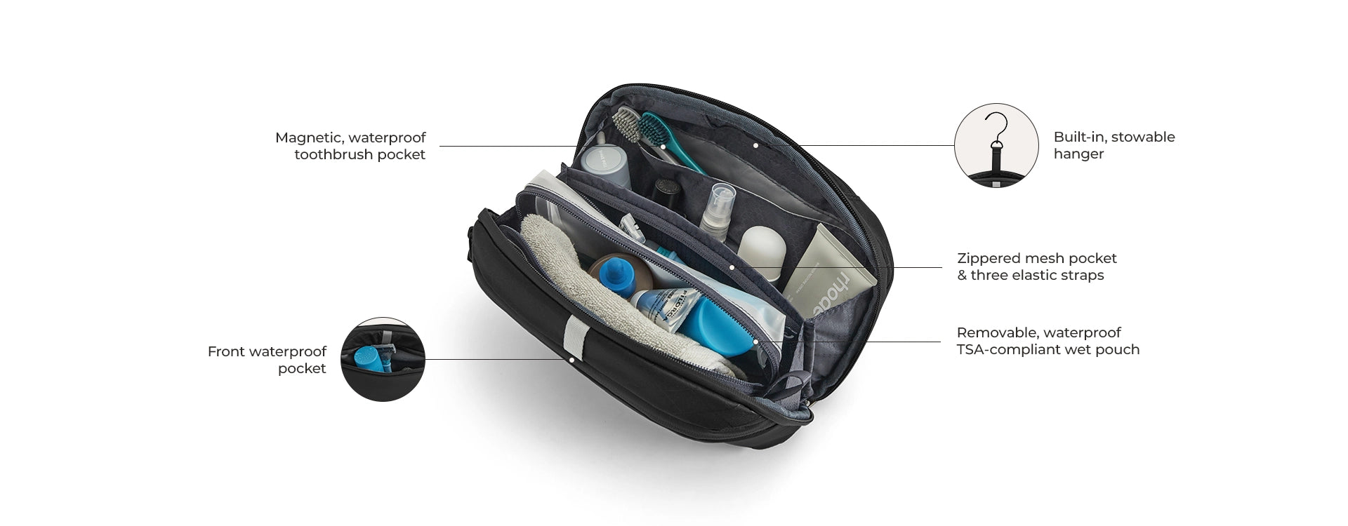 Ventilated pocket keeps your toothbrush dry, safe, and not brushing up on your shampoo.